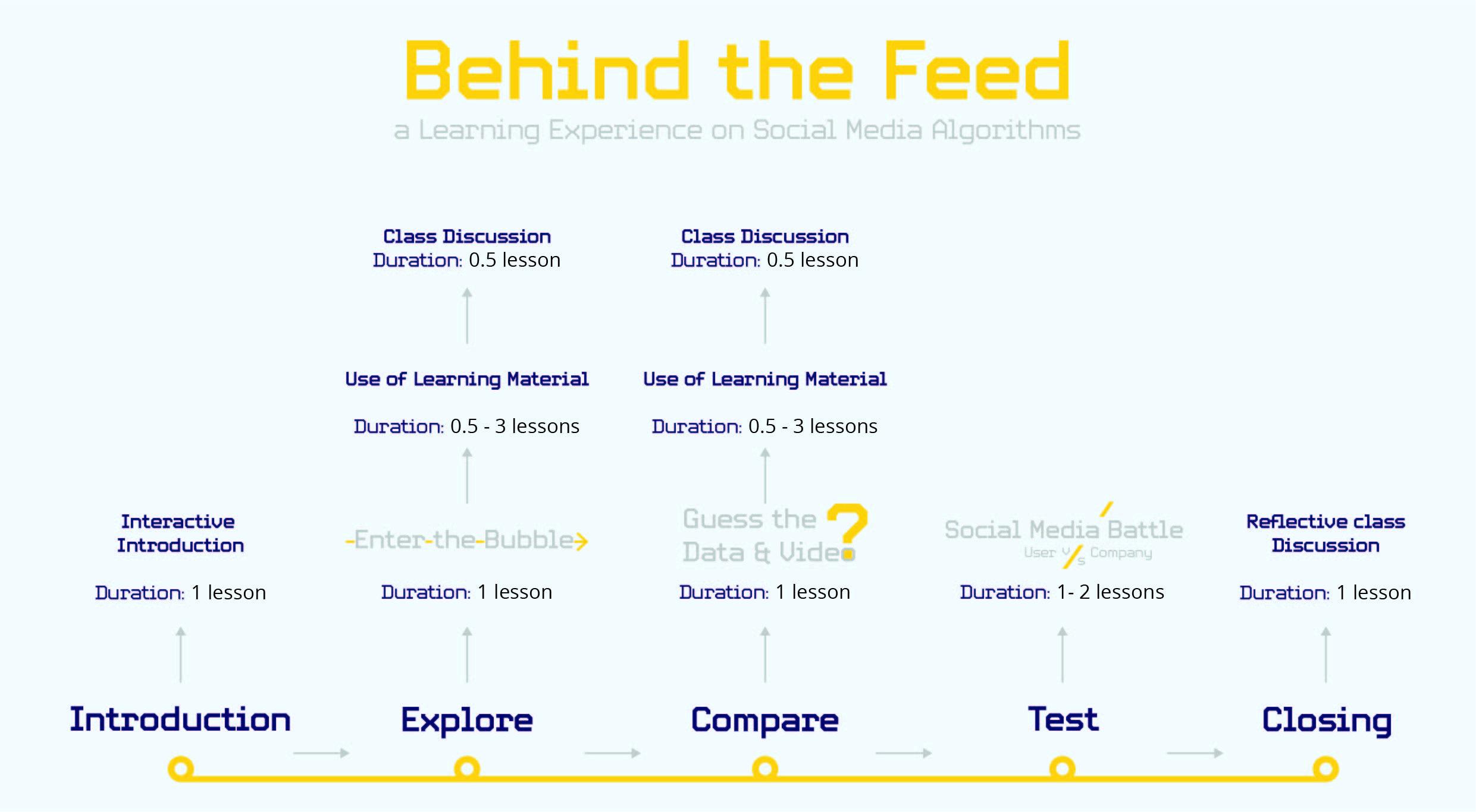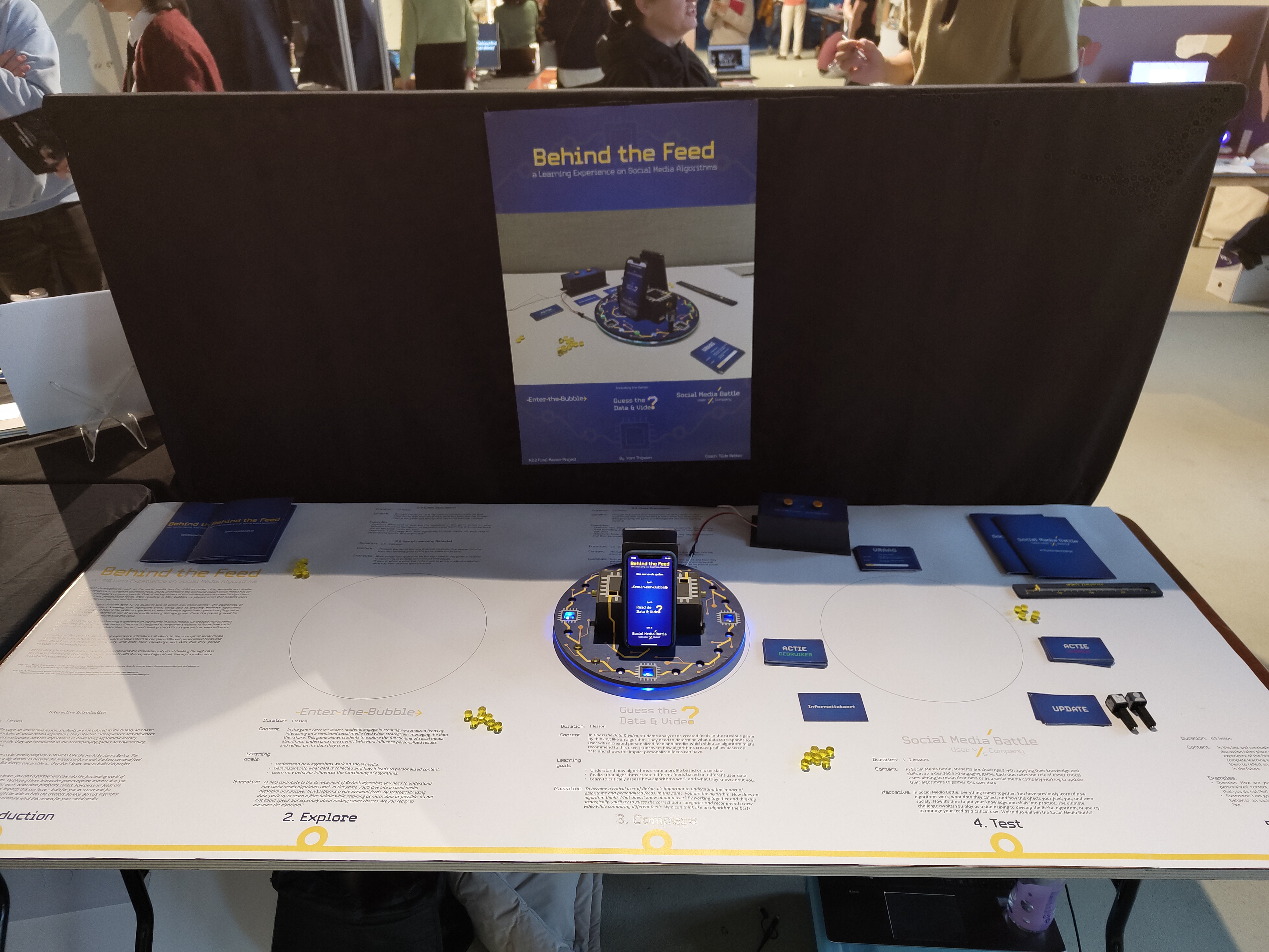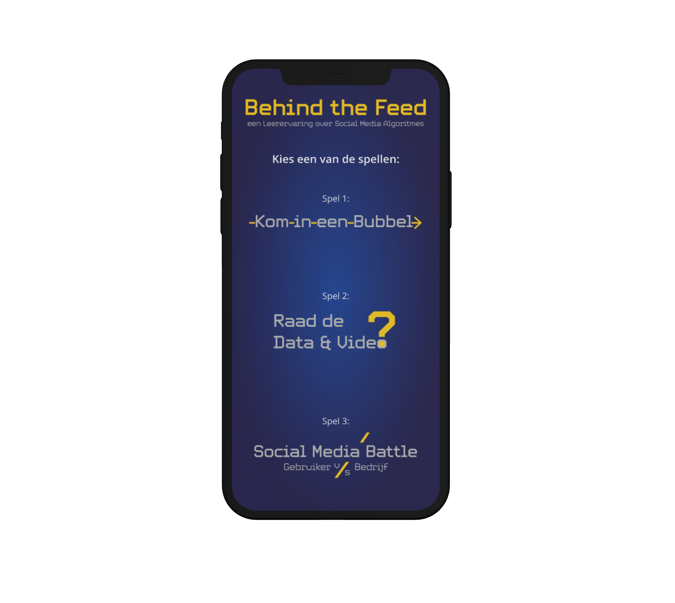 Behind the Feed is een gamified leerervaring over sociale media-algoritmes voor leerlingen van 12 tot 16 jaar. De op maat te maken lessenserie bestaat uit vijf fasen waarin leerlingen ontdekken hoe sociale media-algoritmes werken, hun impact evalueren en vaardigheden ontwikkelen om social media kritischer te gebruiken, wat bijdraagt aan hun algoritmische geletterdheid. De leerervaring bevat drie interactieve en onderling verbonden spellen: Enter the Bubble, Guess the Data & Video en Social Media Battle, en combineert lesmateriaal en klassikale discussies om kritisch denken en verantwoord gebruik van social media te stimuleren.