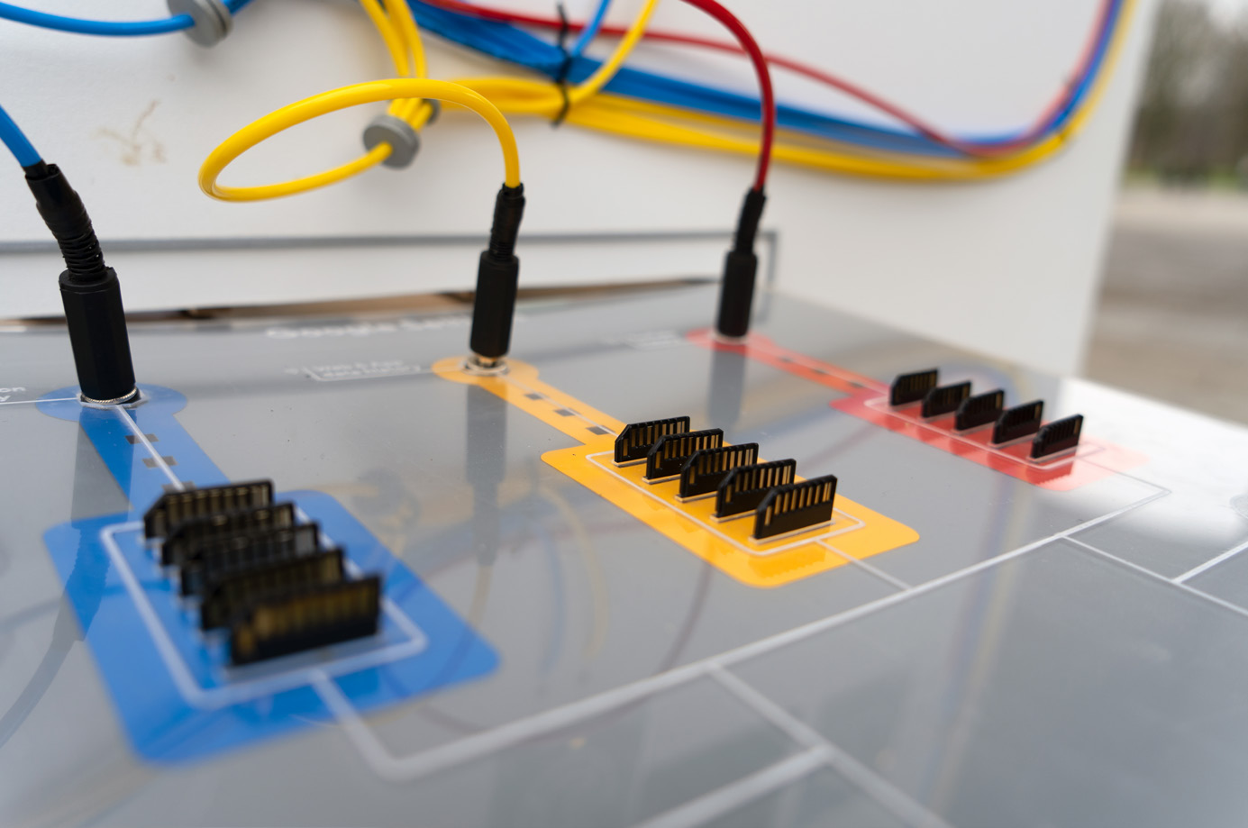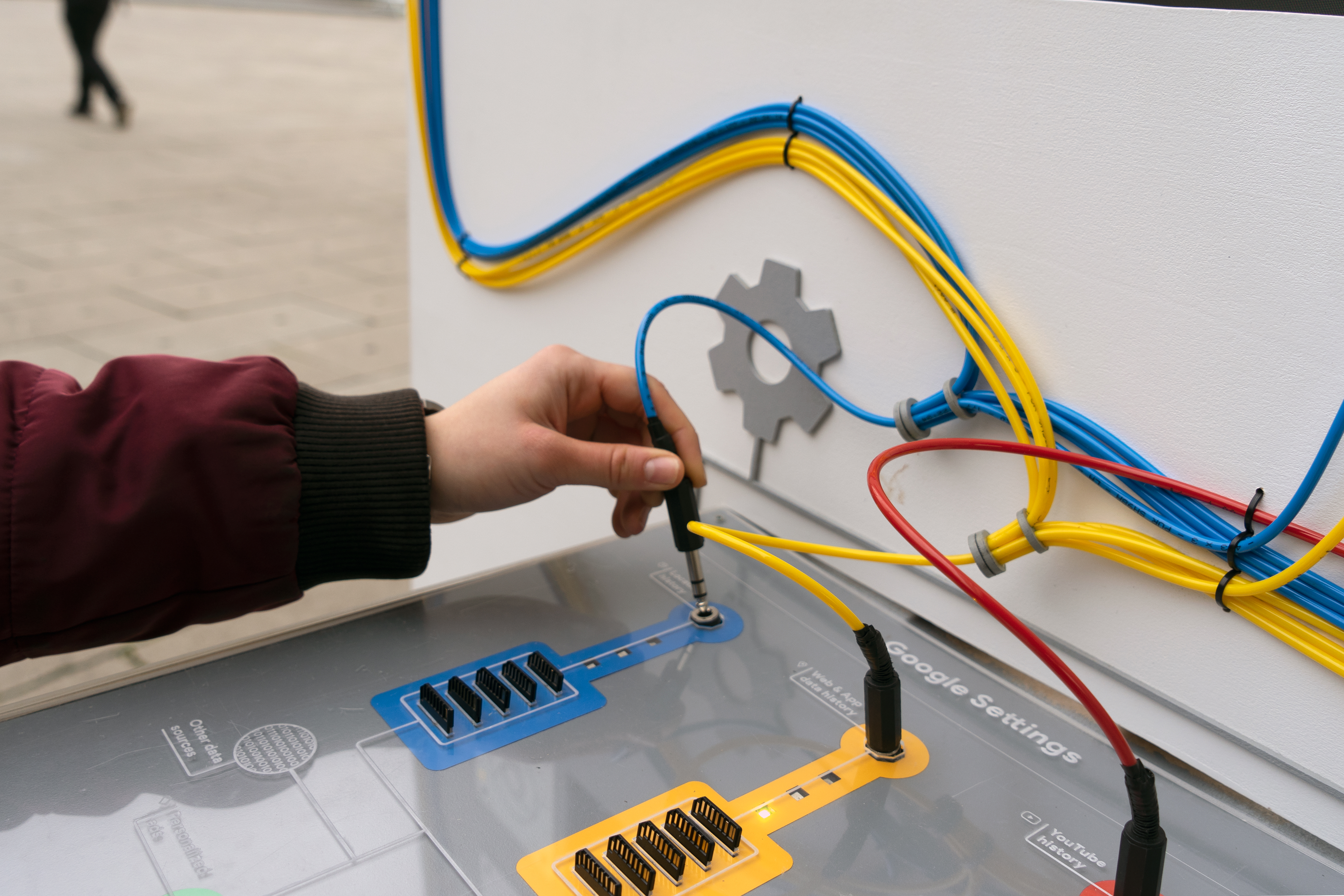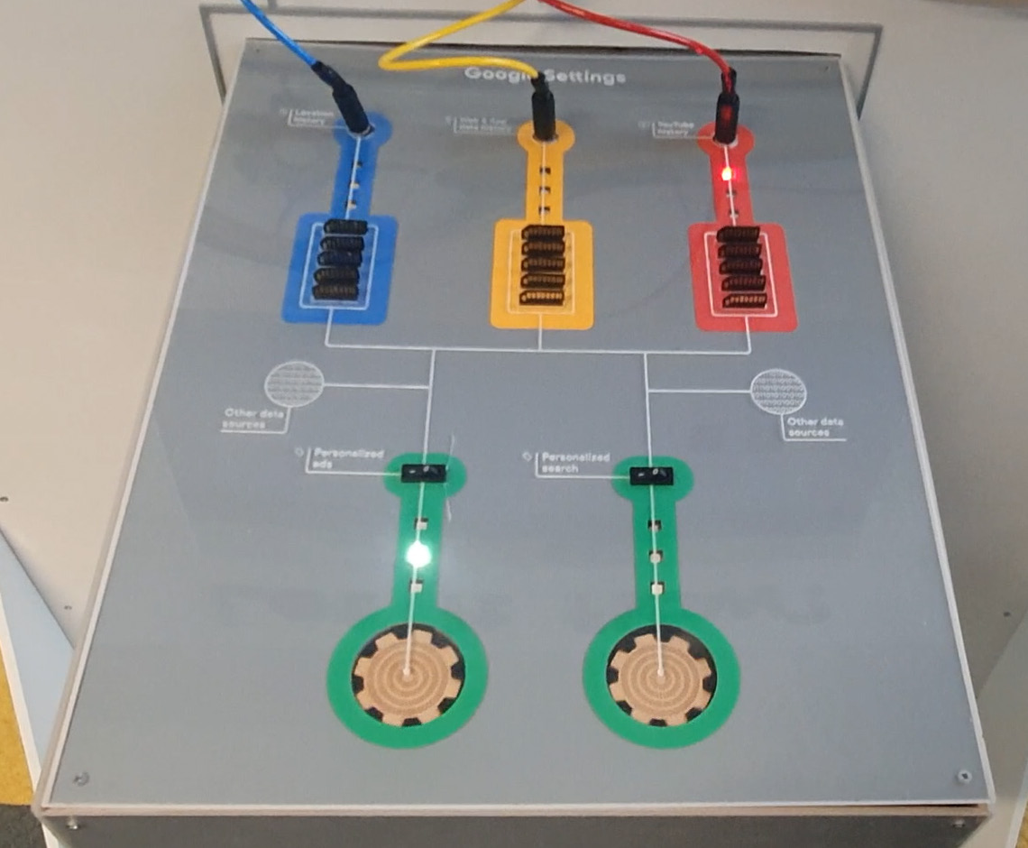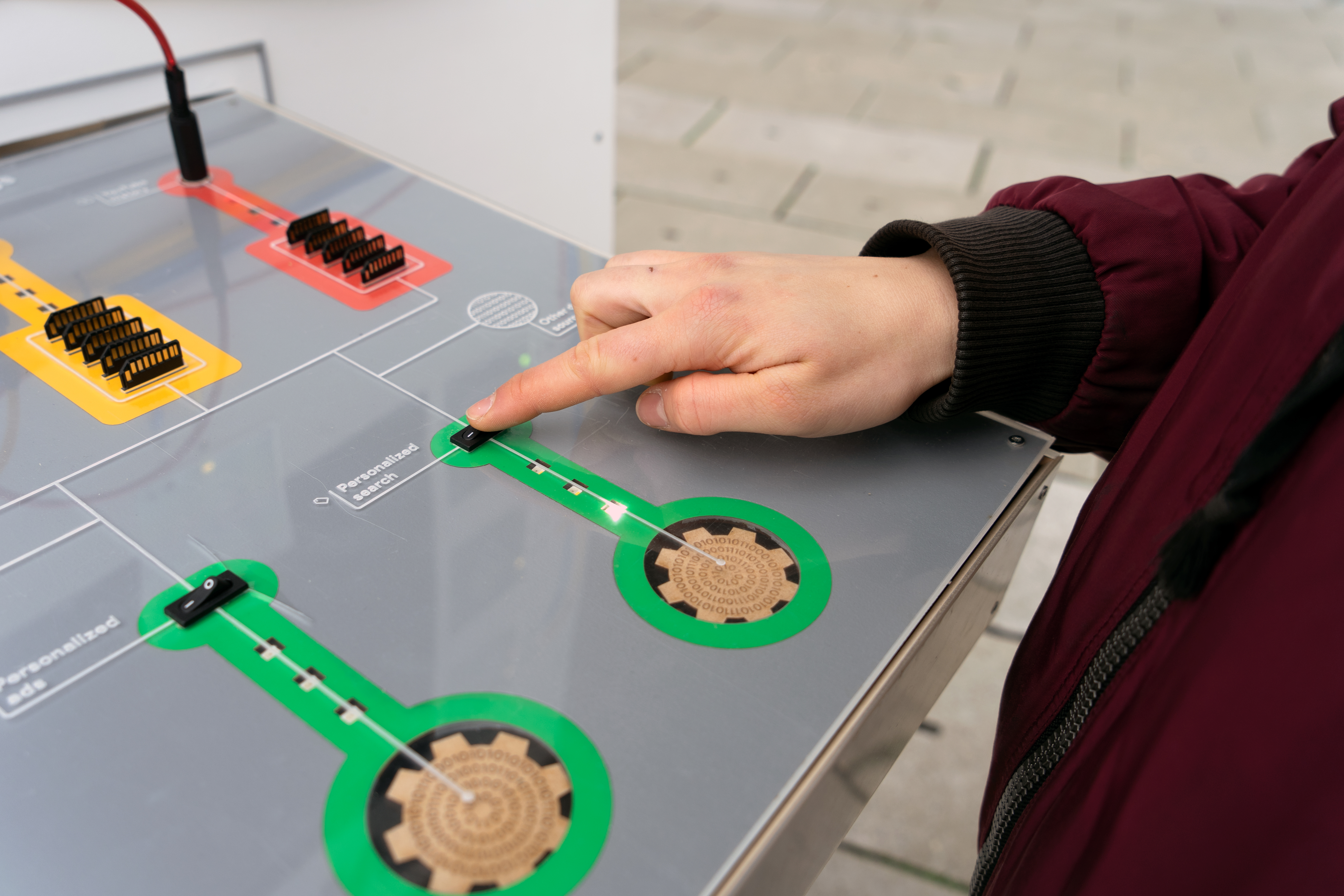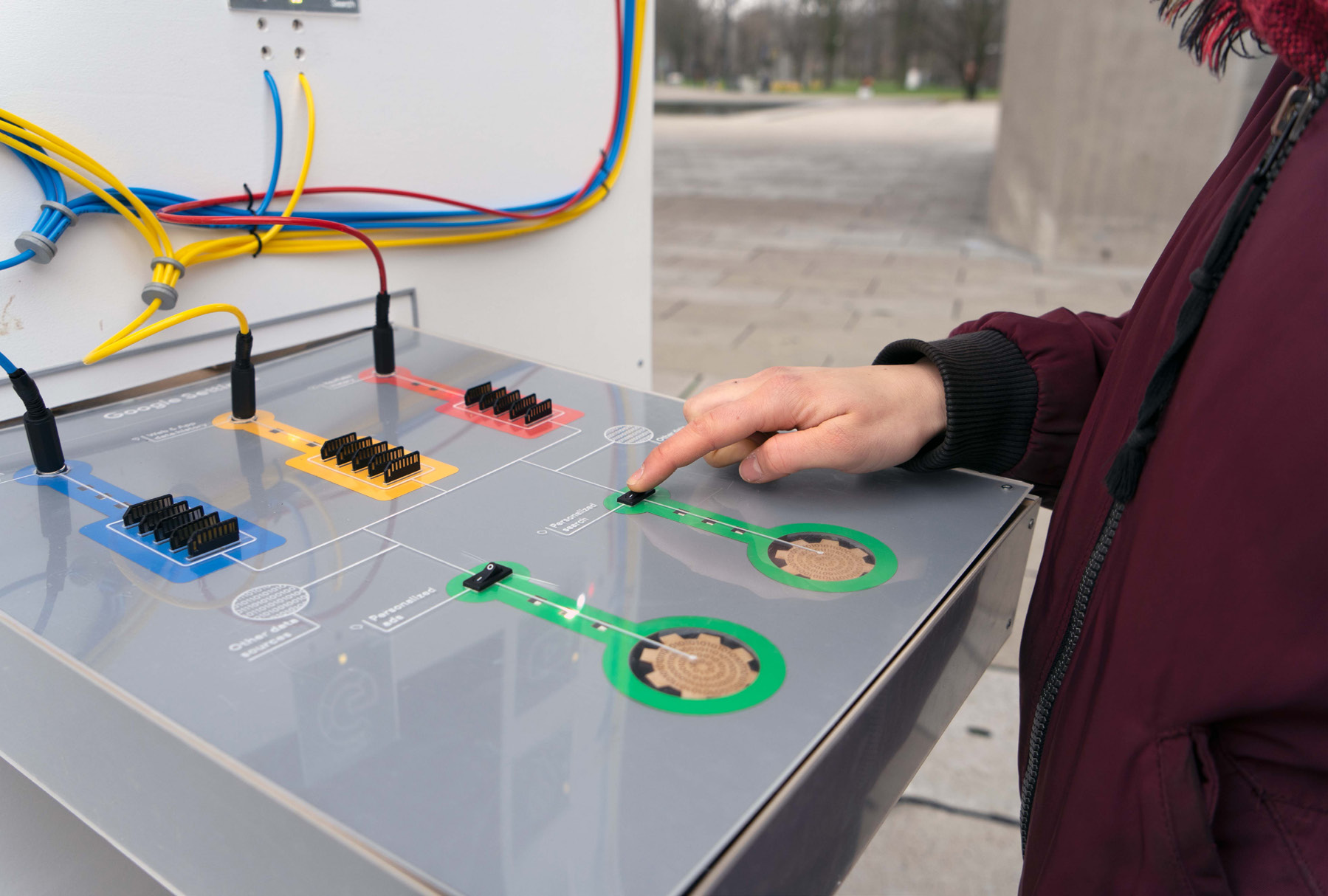 In dit project was ik vooral verantwoordelijk voor de ontwikkeling en realisatie van de technologie van de prototypes en het eindontwerp. Door kabels aan of uit te sluiten en schakelaars aan of uit te zetten, wordt de datastroom van de vijf categorieën gestart of gestopt. Dit wordt weergegeven via de animatie van de LED’s en de draaiende tandwielen. Op het scherm zien bezoekers vervolgens welk effect het aan- of uitzetten van deze instellingen heeft.